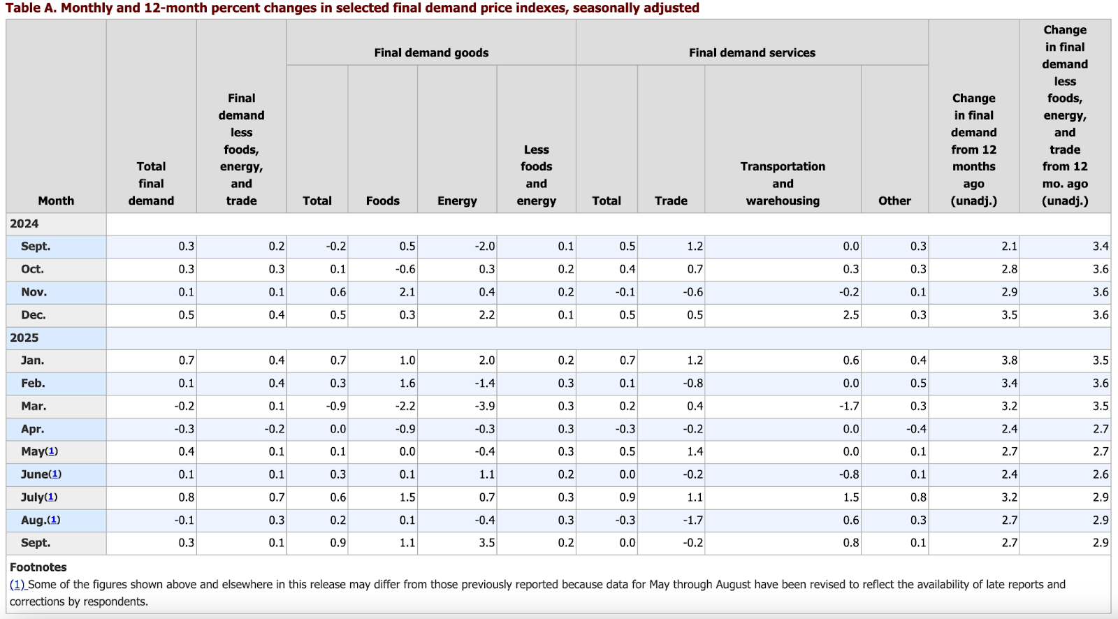 - Producer Price Index (PPI) up in September after decline in August: Per the Bureau of Labor Statistics, headline PPI rose 0.3% MoM after dipping 0.1% in August. Prices for final-demand goods jumped 0.9%, the largest monthly gain since early 2024, with 2/3rds of the increase coming from energy (+3.5%) and food (+1.1%). By contrast, the final-demand services index was unchanged in September. Core PPI (less energy and food) rose 0.1% MoM, and YoY headline and core PPI increased 2.7% and 2.9% respectively.