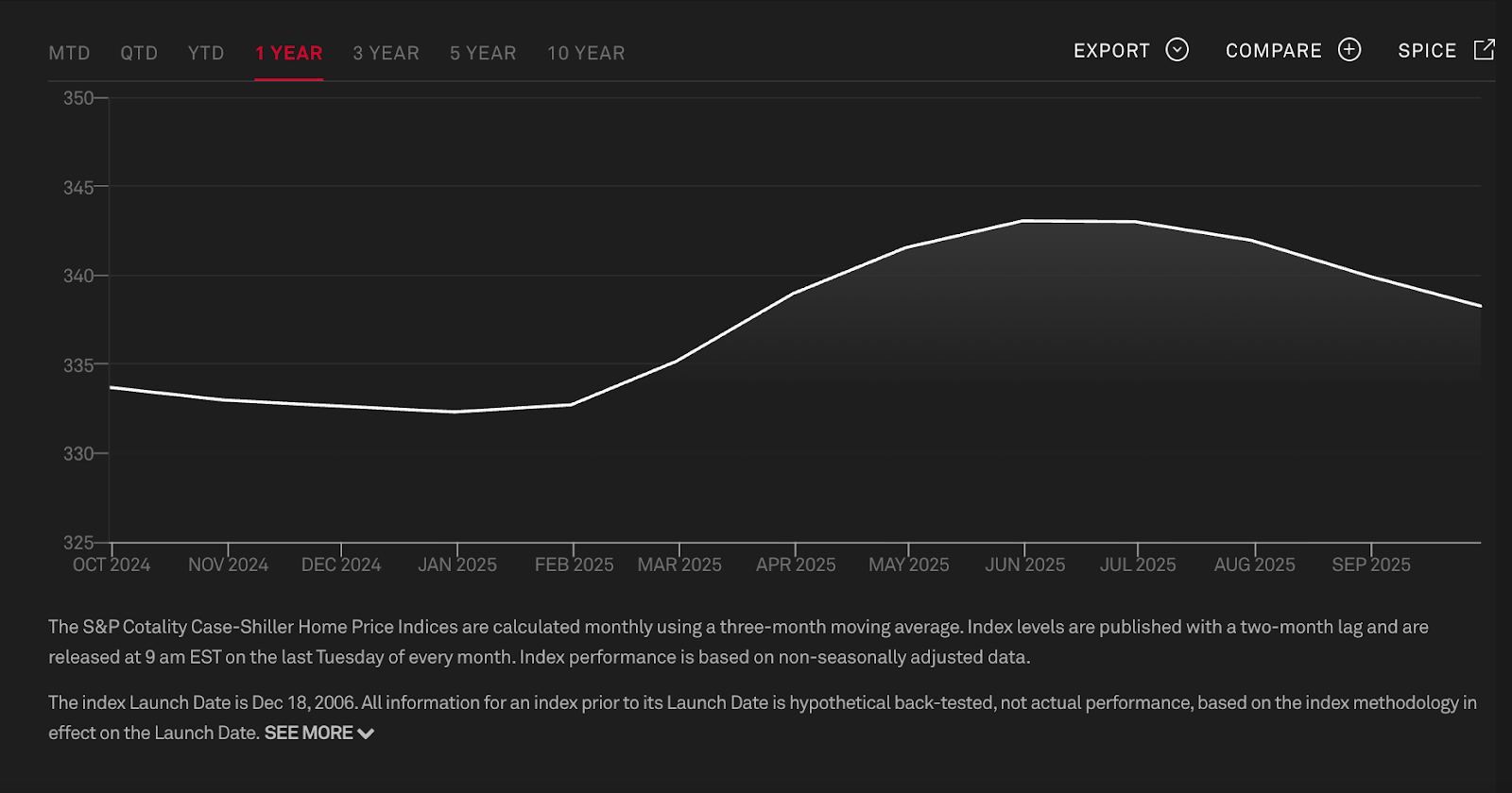 - 20-City Index posts slowest annual growth in years: The S&P Cotality Case-Shiller 20-City Index rose 1.4 % year-over-year in September 2025, the eighth consecutive month of decelerating price growth and the weakest annual increase since mid-2023. On a non-seasonally adjusted basis, prices fell about 0.5% month-over-month in September (following a −0.6% drop in August). The broader S&P Cotality Case-Shiller U.S. National Home Price Index posted a 1.3% year-over-year gain, down from 1.4% the prior month — also the weakest reading in over two years. The Sun Belt shoulder the largest declines in price, reflecting deepening divides in regional housing markets.