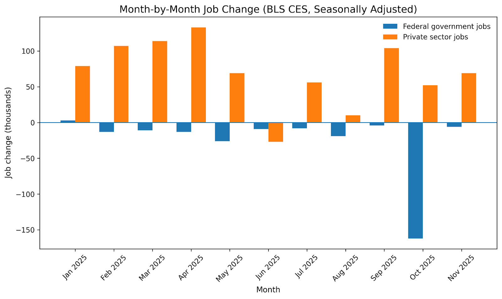 - Payrolls up in November as unemployment climbs amid Federal layoffs: Per the Bureau of Labor Statistics, nonfarm payrolls rose with 64,000 jobs in November, a reversal of the job losses recorded from earlier in the year. Unemployment, however, crept to 4.6%, the highest read since September 2021. The healthcare sector recorded the biggest gains, while construction grew modestly and transportation/warehousing continued its multi-month decline. When we look at federal vs. private sector unemployment losses and gains YTD (-268,000 vs. +766,000 respectively), we can clearly see the job market bifurcating, with the private sector adding 2.9 jobs to every 1 job lost in the federal public sector. As the Trump administration’s fiscal austerity enervates public sector jobs, the private sector, though not particularly strong, is seeing growth.