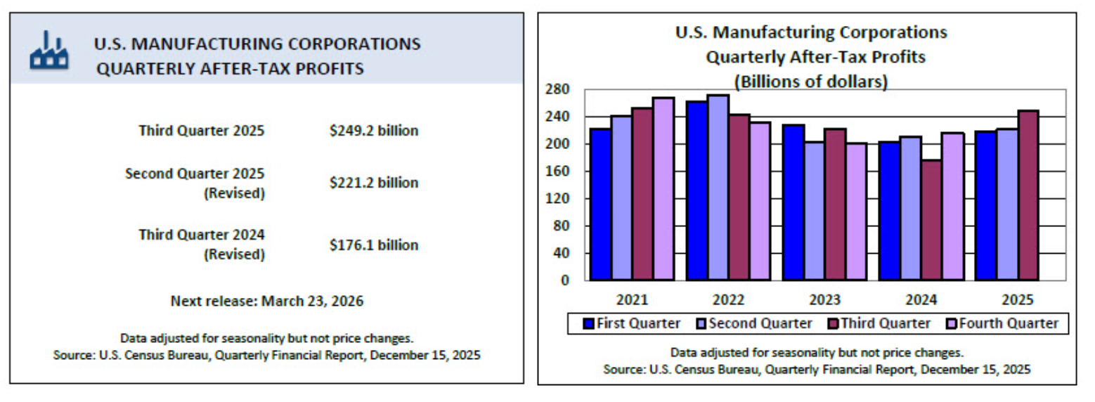 - Manufacturing profits, sales rise in Q3: The U.S. Census Bureau reported that seasonally-adjusted, after-tax profits for U.S. manufacturers rose to $249.2 billion in Q3 2025, a $28 billion bump from Q2 and up $73.1 billion from Q3 2024’s revised figure. Manufacturing sales increased from $1.98 trillion in Q2 2025 to $2.03 trillion in Q3. Durable goods saw the largest profit growth at $157.9 billion, while nondurable goods rose modestly.