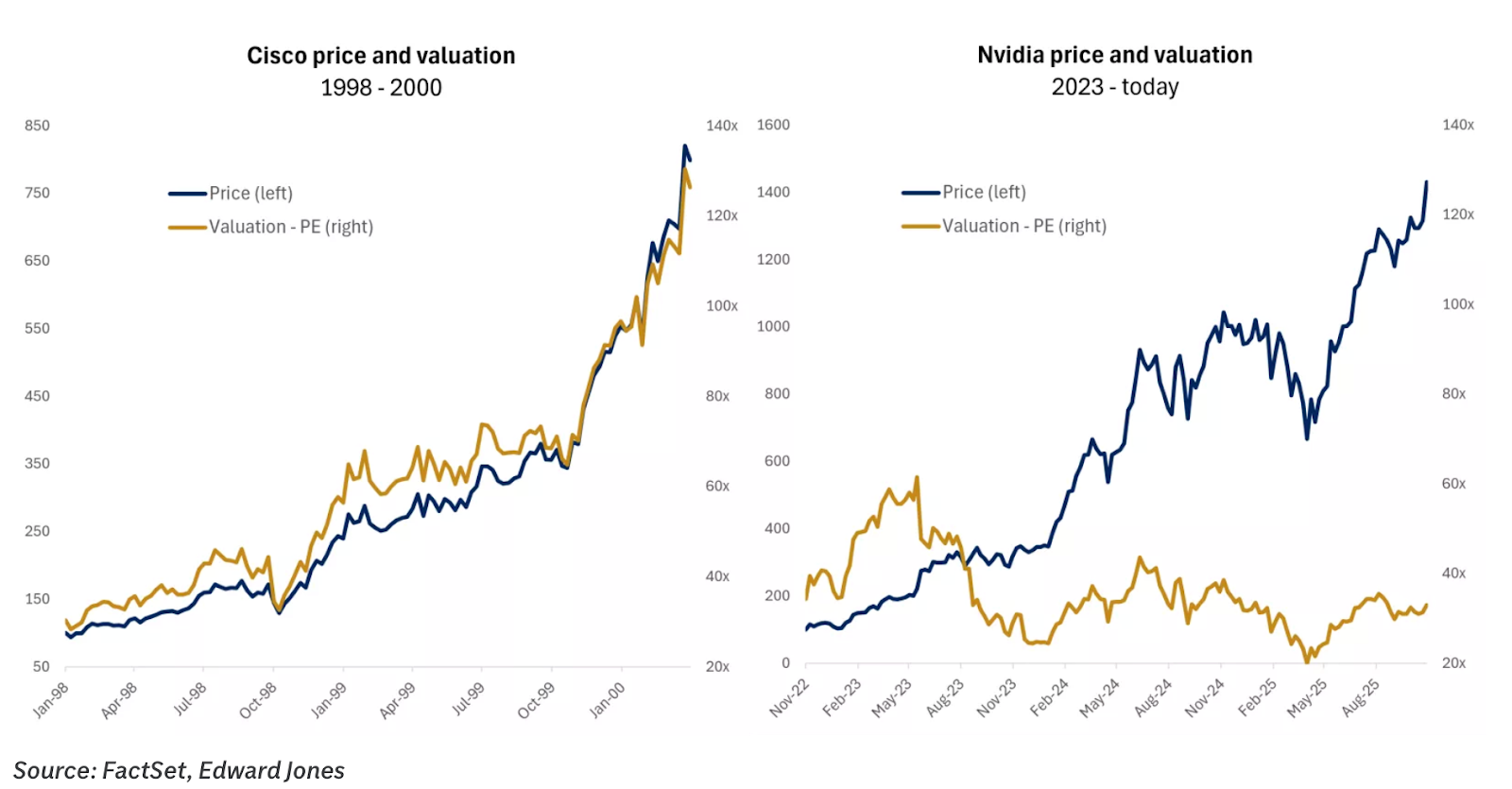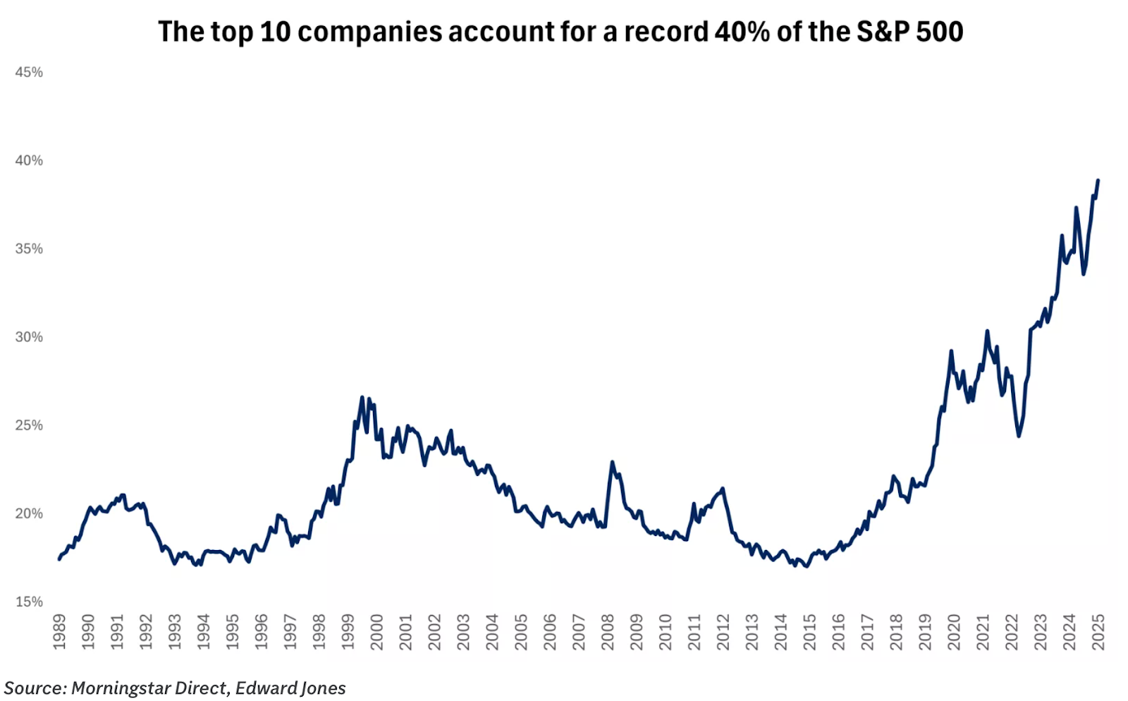 - S&P 500’s top 10 companies account for 40% of the index: Per EdwardJones, the top 10 stocks in the S&P 500’s make up 40% of the entire index’s capitalization, a record that puts this weighting ~12% above where it was at the peak of the Dotcom Bubble. Still, EdwardJones does note that Nvidia (NASDAQ: NVDA), the most valuable company in the S&P 500, its price-to-earnings ratio is still ~1/4th of Cisco’s (NASDAQ: CSCO) at the time of the Nasdaq’s peak in 2000.