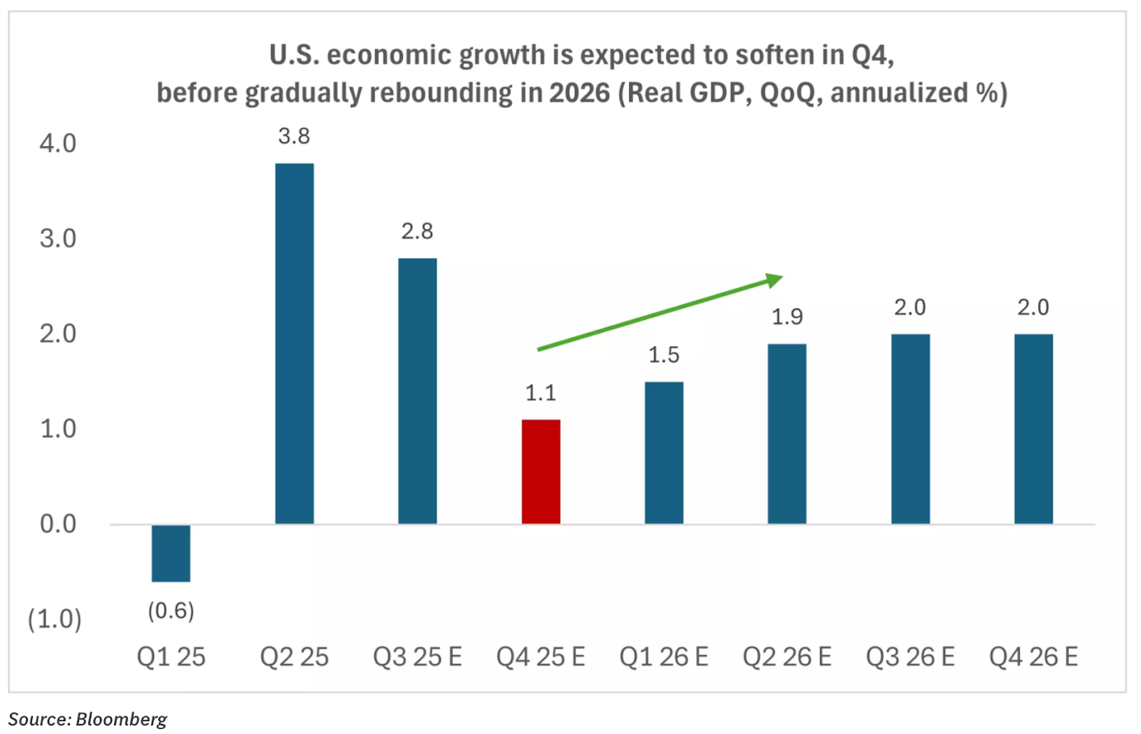 - Impact from government shutdown expected to drive down Q4 GDP: The government shutdown came to an end last week when President Trump signed the Congressional funding bill, putting an end to a 43 day gridlock that will go down as the longest Federal government shutdown in U.S. history. As detailed by Edward Jones, the Congressional Budget Office estimates that the shutdown could shave as much as 1.5% off U.S. Q4 GDP growth, dropping estimates from 2.5-3% to 1-1.5%.