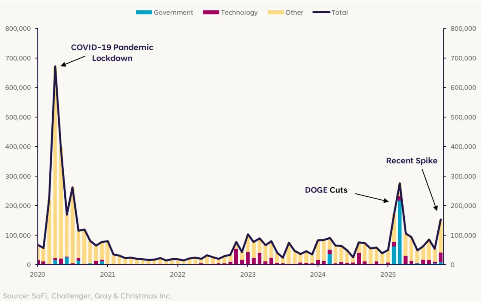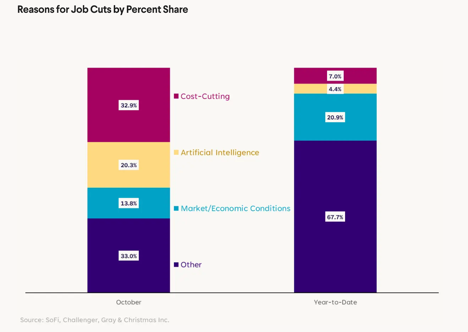 - Cost-cutting, AI surge as reasons for terminations in October: According to data from Challenger, Gray & Christmas presented by SoFi Head of Investment Strategy, Liz Thomas, cost-cutting was the top reason for job cuts last month, accounting for 33% of all terminations, versus 20% for AI, 14% for economic conditions, and 33% for other reasons.