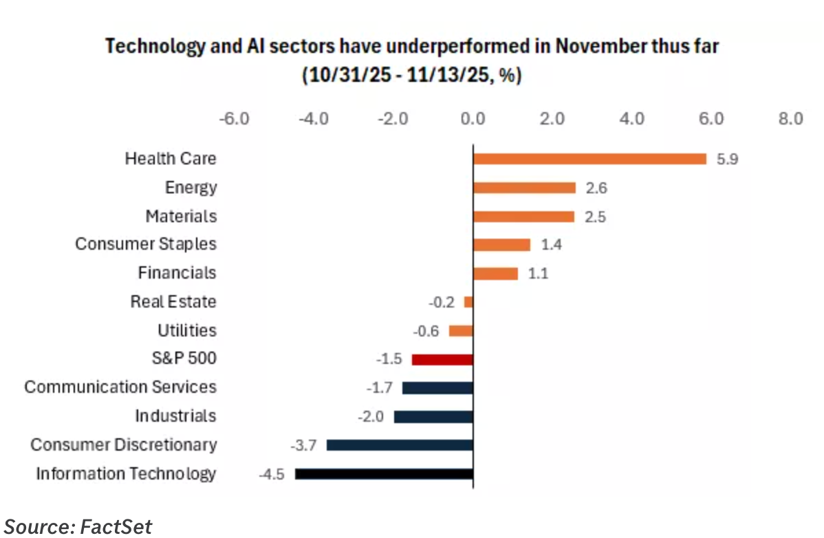 - Tech stocks lead market sell off: The cohort of AI and tech stocks that have been the life force of 2025’s market have been enervated so far this November. Per FactSet, information technology stocks were down 4.5% in November as of November 13, while healthcare (+5.9%), energy (+2.6%), and materials (+2.5%) have led all other industries.