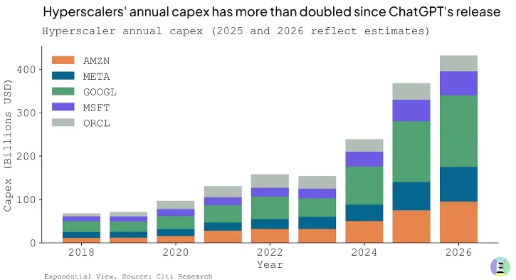 - Data center CAPEX spend from big 5 could top $400B in 2026: According to estimates from Citi Research, CAPEX datacenter spend from Amazon, META, Google, Microsoft, and Oracle alone could hit $320 billion in 2025 and $400 billion in 2026, up from $80 billion in 2018.