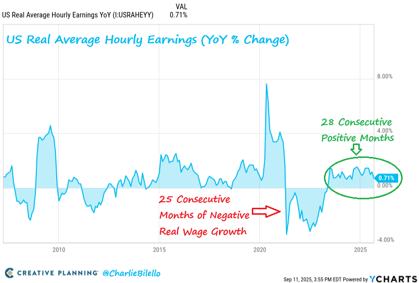 - Wage growth rises for 28th month in a row in September: In the hangover of COVID, the United States saw a record 25 straight months of negative real wage growth, but that trend has now flipped. Per Charlie Bilello, wage growth has outpaced inflation for 28 consecutive months as CPI moderates to 2.5-2.5% and wages grow 4-5% YoY.