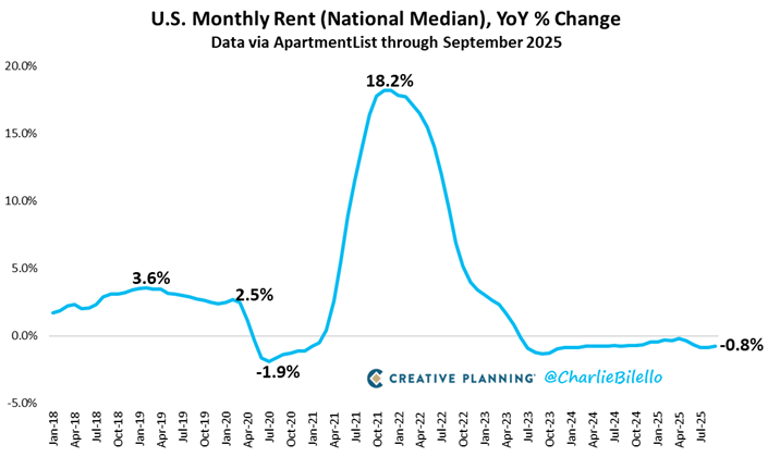 - Renting prices down for 28th consecutive YoY decline: Per ApartmentList data cited by Charlie Bilello, rental prices have fallen for 28 consecutive months in the U.S., with renting costs falling 0.8% YoY in September. Renting a home is currently cheaper than buying in all of the 50 largest metropolitan areas in the U.S. The national median rent is $2,050/month, versus ~$3,000/month for a median mortgage.