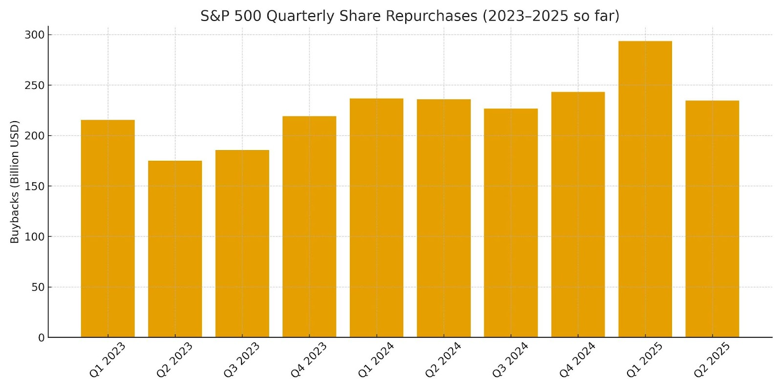 - Stock buybacks slowed in Q2: S&P 500 companies spent substantially less on stock repurchases in Q2 than in Q1. Companies bought $234.6 billion of their own shares in Q2, a 20% haircut from Q1 and a fractional decrease from Q2-2024. That said, the 12-month rolling total for stock buybacks ($997.8 billion) is still up over the prior 12-month period. As the data suggests, companies are tightening up their cash positions, with leadership citing tariff and economic uncertainty and cash flow concerns among others for the slowdown in share repurchases last quarter.