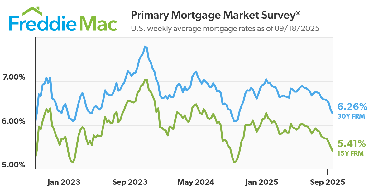 - Interest rates slip lower on easing Fed policy: 30-year and 15-year mortgage rates in the U.S. dropped last week after the Fed slashed rates. The average 30-year rate fell 9 bps last week to 6.26%, according to Freddie Mac, with 15-year rates falling 9 bps as well to 5.41%. In January of this year, 30-year and 15-year mortgages were 7.04% and 6.27% on average, and in October of 2023 they were as elevated as 7.79% and 7.03%, the highest rates in over two decades.