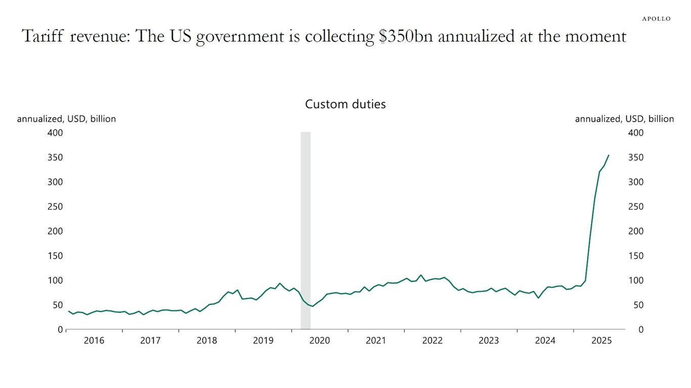 - U.S. tariff income hits $350 billion ARR: According to research from Apollo Sløk, the United States government is on track to haul in $350 billion in revenue for the year from tariffs. If it holds, this would represent roughly 18% of annual household income tax payments.