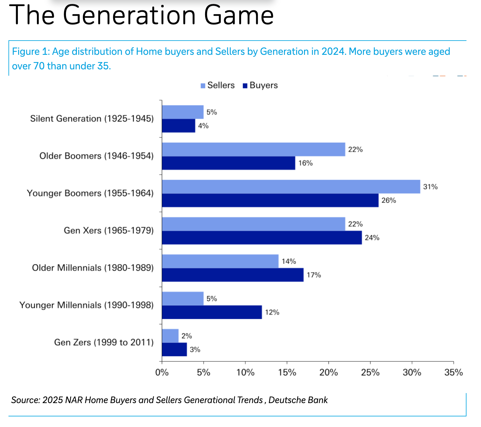 - 46% of home sales in 2024 to buyers aged 60+: Deutsche Bank: According to a research note from Deutsche Bank, 46% of home buyers in the U.S. were 60 years or older last year, while 22% of buyers buyers were 70 and older and only 15% buyers were 35 and younger. “Over the long run, property is an asset that ultimately gets redistributed from one generation to the next. Right now, that handoff is being stalled by high interest rates and elevated home prices. At some point, either—or both—will have to adjust, or real wages for younger people will need to rise sharply. Eventually, the younger generation will own the homes currently held by the older generation. We just don’t yet know what the price will be,” the note reads.