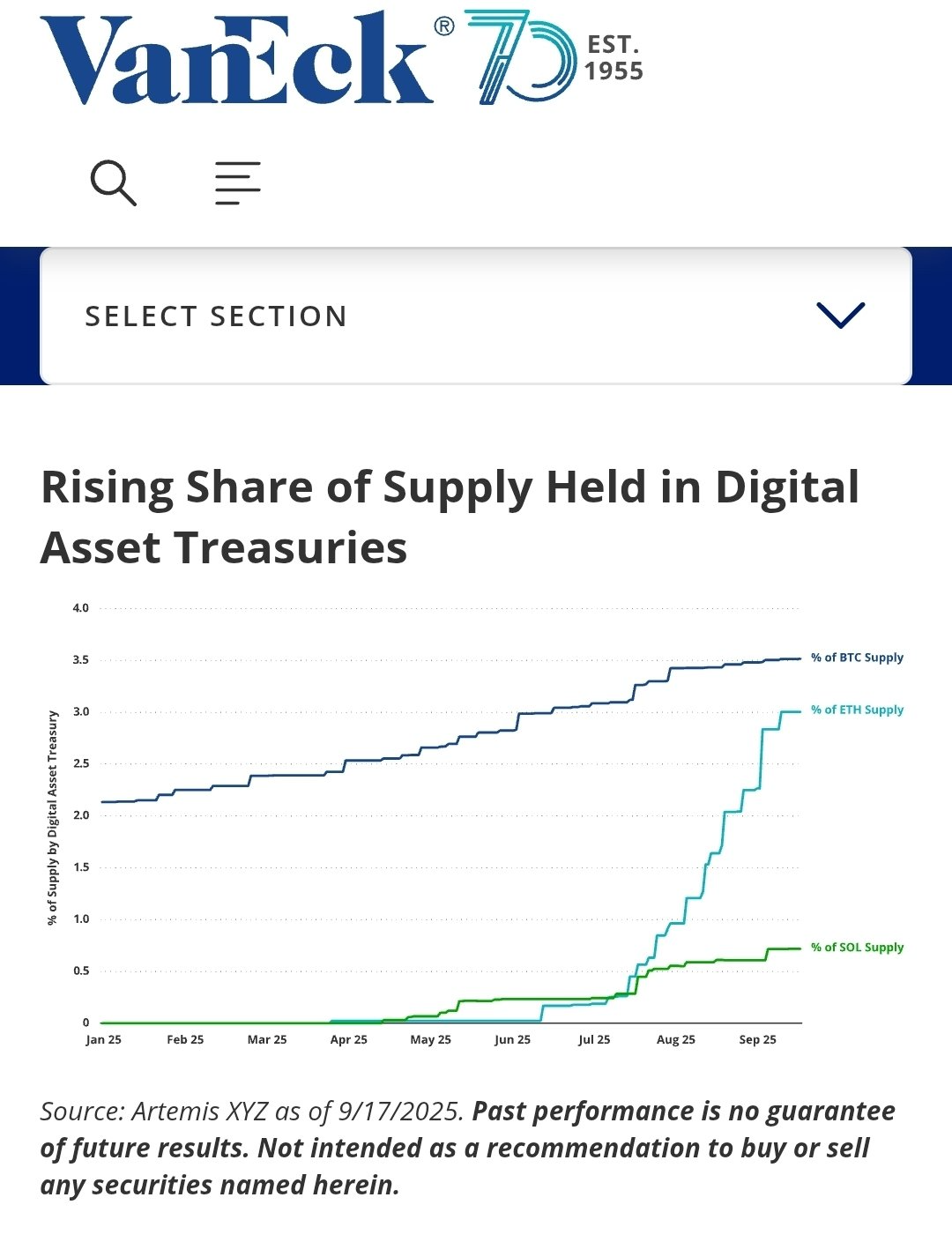 - ETH treasury companies are catching up to Bitcoin: Crypto’s number 2 asset, Ethereum, is starting to catch up to King Bitcoin in the crypto treasury race. According to VanEck, known corporate treasuries hold nearly 3.5% of Bitcoin’s total supply, versus 3% for Ethereum. In June, the amount of Ethereum’s total supply held in corporate treasuries was ~0.1%.